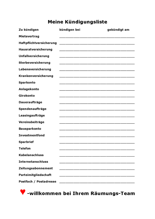 Ihre Kündigungsliste zum Ausdrucken: