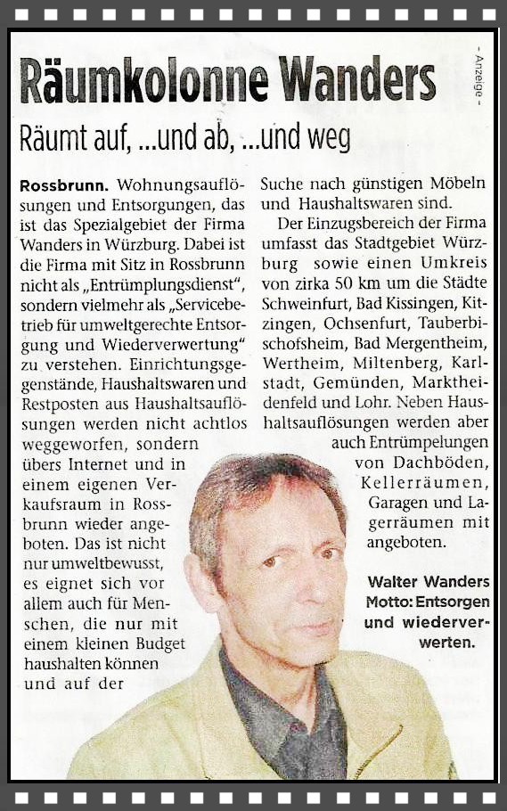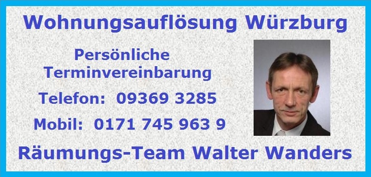 Wohnungsauflösungen und Entsorgungen, das ist das Spezialgebiet der Firma Wanders in Würzburg. Dabei ist die Firma mit Sitz in Rossbrunn nicht als „Entrümpelungsdienst“ sondern vielmehr als „Servicebetrieb für umweltgerechte Entsorgung und Wiederverwertung“ zu verstehen. Einrichtungsgegenstände, Haushaltswaren und Restposten aus Haushaltsauflösungen werden nicht achtlos weggeworfen, sondern übers Internet und in einem eigenen Verkaufsraum in Rossbrunn wieder angeboten. Dies ist nicht nur umweltbewusst, es eignet sich vor allem auch für Menschen, die nur mit einem kleinen Budget haushalten können und auf der Suche nach günstigen Möbeln und Haushaltswaren sind. Der Einzugsbereich der Firma umfasst das Stadtgebiet Würzburg sowie einen Umkreis von zirka 50 km um die Städte Schweinfurt, Bad Kissingen, Kitzingen, Ochsenfurt, Tauberbischofsheim, Wertheim, Miltenberg, Gemünden, Marktheidenfeld und Lohr. Neben Haushaltsauflösungen werden aber auch Entrümpelungen von Dachböden, Kellerräumen, Garagen und Lagerräumen mit angeboten.