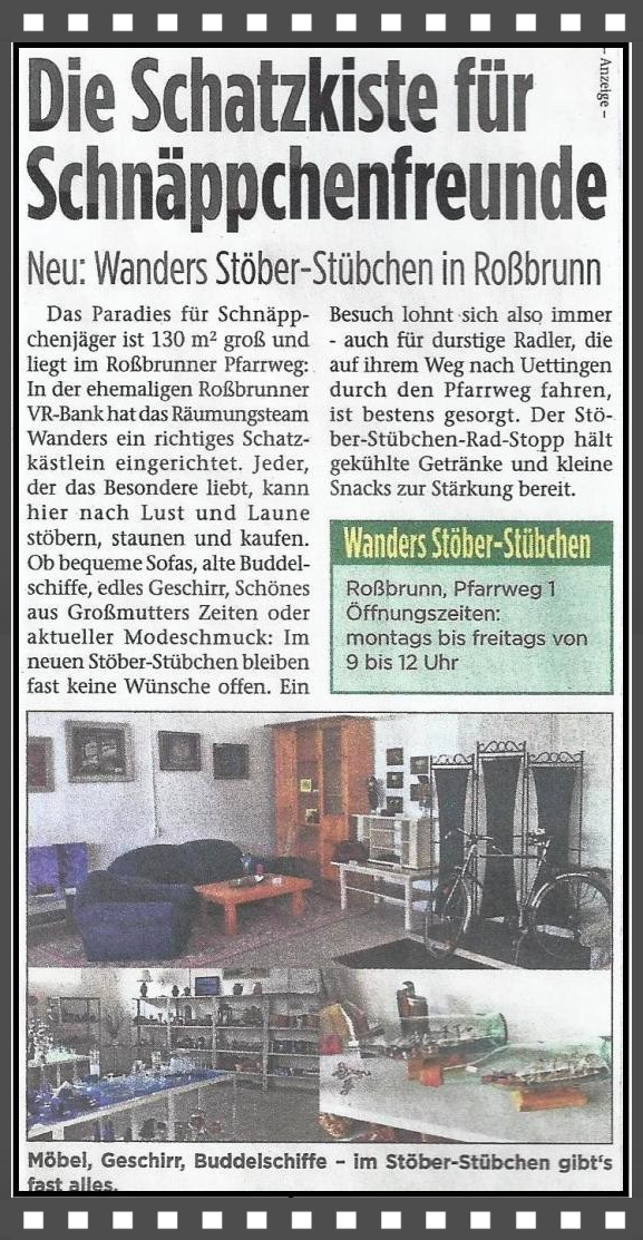Das Paradies für Schnäppchenjäger ist 130 qm groß und liegt im Rossbrunner Pfarrweg. In der ehemaligen VR-Bank hat das Räumungsteam Wanders ein richtiges Schatzkästlein eingerichtet. Jeder, der das Besondere liebt, kann hier nach Lust und Laune stöbern, staunen und kaufen. Ob bequeme Sofas, alte Buddelschiffe, edles Geschirr, Schönes aus Großmutters Zeiten oder aktueller Modeschmuck: Im neuen Stöber-Stübchen bleiben fast keine Wünsche offen. Ein Besuch lohnt sich also immer – auch für durstige Radler, die auf ihrem Weg nach Uettingen durch den Pfarrweg fahren, ist bestens gesorgt. Der Stöber-Stübchen-Rad-Stopp hält gekühlte Getränke und kleine Snacks zur Stärkung bereit.