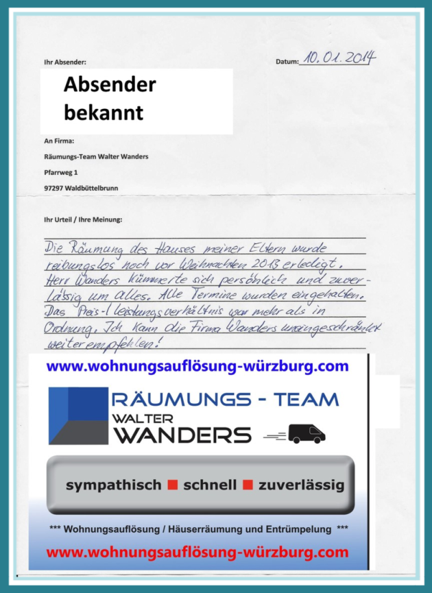 Die Räumung des Hauses meiner Eltern wurde reibungslos noch vor Weihnachten 2013 erledigt. Herr Wanders kümmerte sich persönlich und zuverlässig um alles. Alle Termine wurden eingehalten. Das Preis-Leistungsverhältnis war mehr als in Ordnung. Ich kann die Firma Wanders uneingeschränkt weiterempfehlen!
